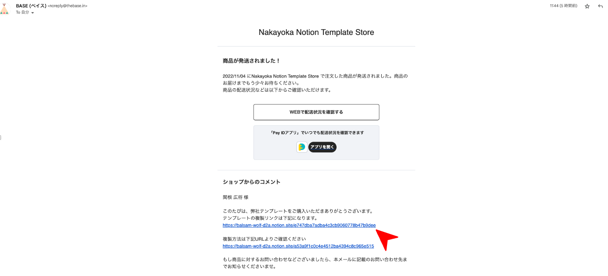 - 届いたメールのショップからのコメントよりテンプレートの複製リンクをクリックします。
